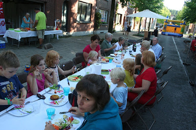 Een regenachtige en dus rustige namiddag op de speelstraat vandaag. De middag werd toch lekker afgesloten met gezamenlijk frietjes van de frituur. Samen gezellig onder de tentjes beschut tegen de regen.... Ambiance !!